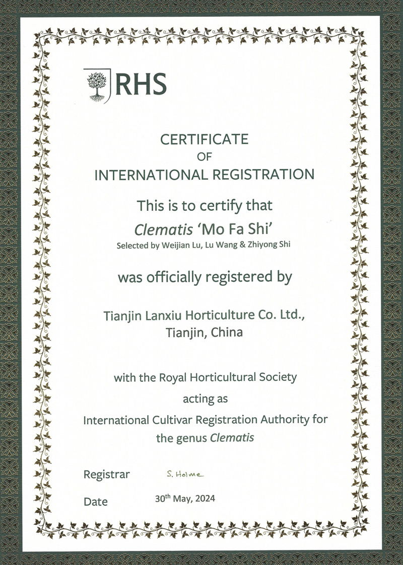 Our flagship variety Clematis ‘Magician’ (铁线莲’魔法师’) has earned dual prestigious honors: the Gilded Award at China’s 2025 Flower Adaptation Trials for outstanding climate resilience, and official international registration by the Royal Horticultural Society (UK) as a globally recognized cultivar – validating its unique horticultural value and export-ready quality.